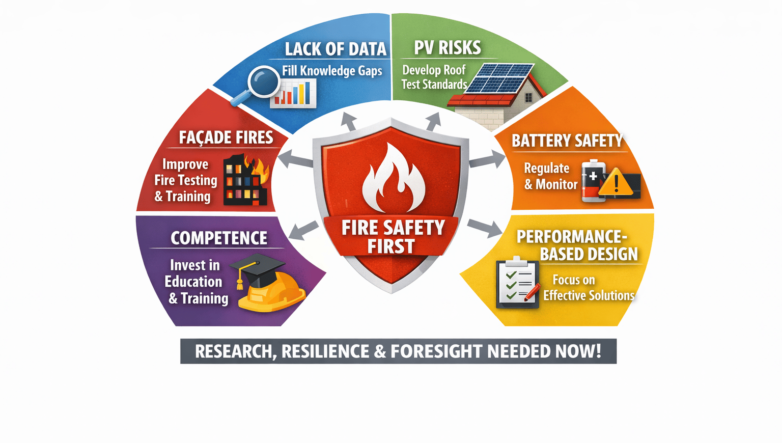 There is also a need for test standards for roofs with PV installations, battery passport protocols, BESS implementation rules, … - the list is quite long, and it is growing because implementation outpaces safety regulations and knowledge. To improve upon this situation and ensure preparedness, robustness and resilience, we need foresight and bold visions that include a culture and political agenda that place fire safety at the forefront – it should not be an afterthought.